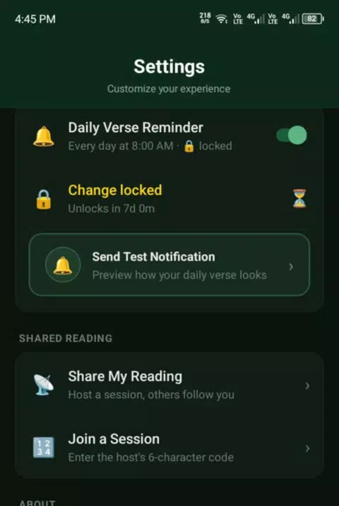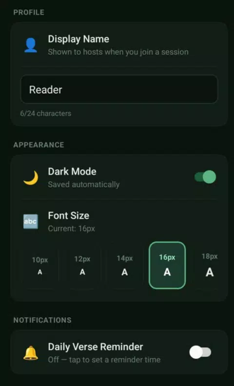 My Bible App includes instant access to any book, chapter, and verse, a Daily Verse feature with inspirational verses, dark mode support, adjustable font size, daily verse notifications, Shared Reading for reading together with others, and a clean, distraction-free reading experience.